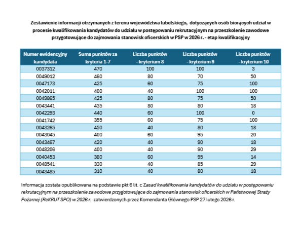 Informacja została opublikowana na podstawie pkt 6 lit. c Zasad kwalifikowania kandydatów do udziału w postępowaniu rekrutacyjnym na przeszkolenie zawodowe przygotowujące do zajmowania stanowisk oficerskich w Państwowej Straży Pożarnej (ReKRUT SPO) w 2026 r. zatwierdzonych przez Komendanta Głównego PSP 27 lutego 2026 r.