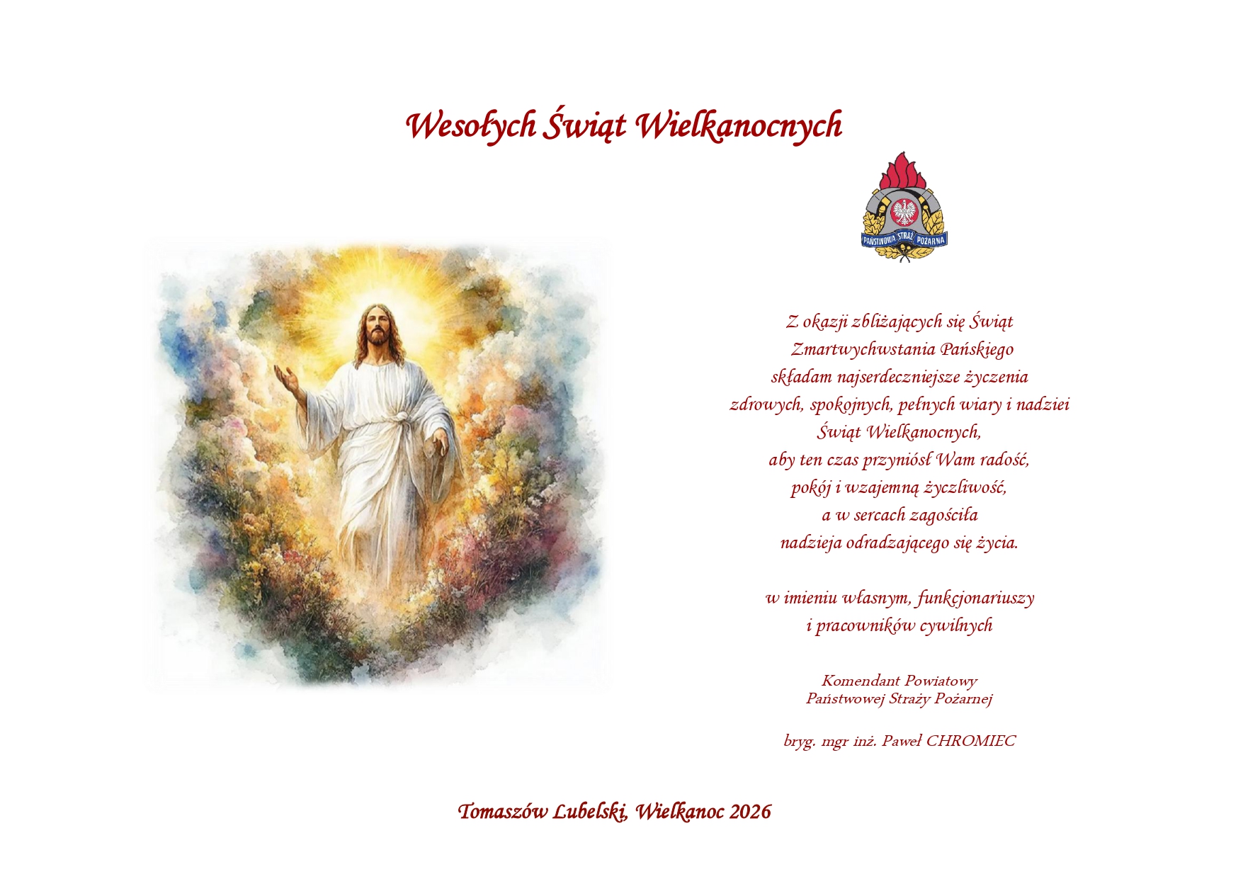 Aktualności, Ważny news Życzenia Komendanta Powiatowego PSP z okazji Świąt Wielkanocnych 3 kwietnia 2026 Wyświetleń: 44