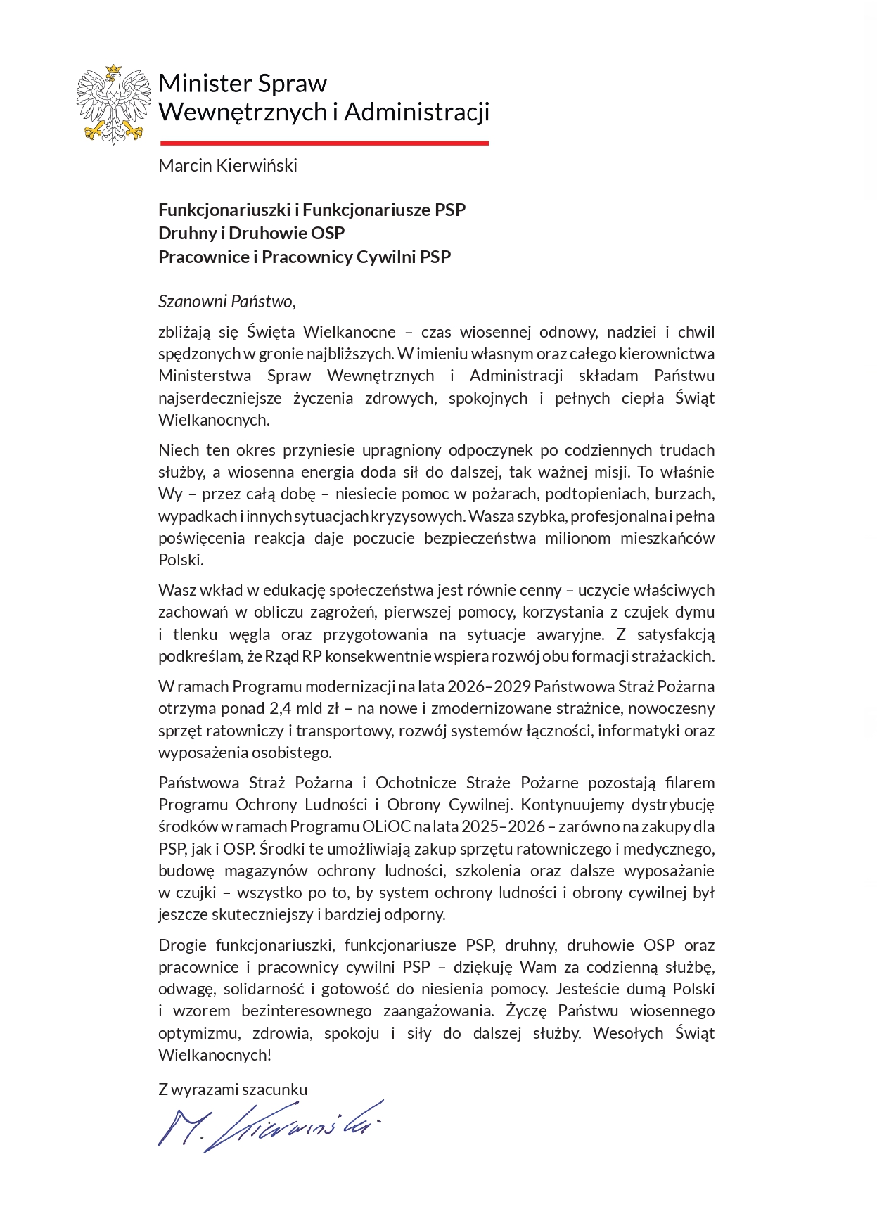Aktualności, Ważny news Życzenia Ministra Spraw Wewnętrznych i Administracji Pana Marcina Kierwińskiego z okazji Świąt Wielkanocy 2026 3 kwietnia 2026 Wyświetleń: 37