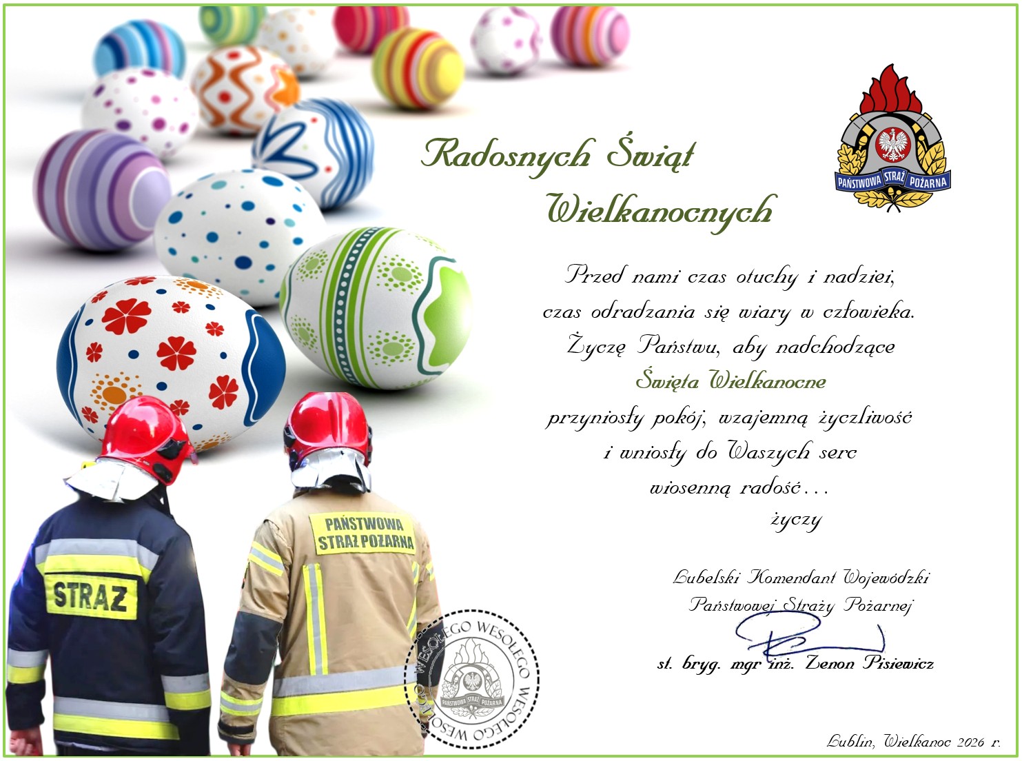 Aktualności, Ważny news Życzenia z okazji Świąt Wielkanocnych Lubelskiego Komendanta Wojewódzkiego PSP st. bryg. Zenona Pisiewicza 3 kwietnia 2026 Wyświetleń: 40